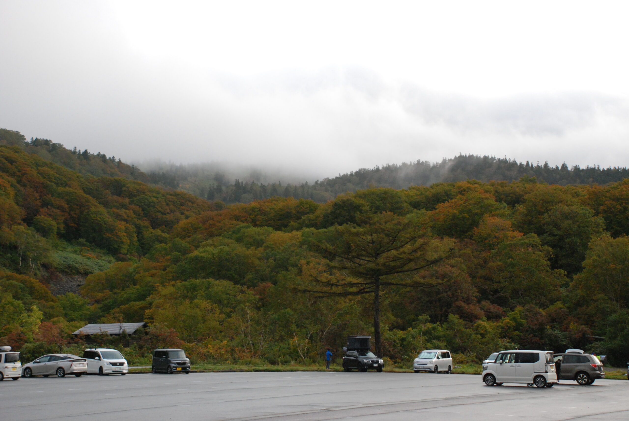 登山口のある酸ヶ湯温泉駐車場。三連休初日ですが、小雨のためにがらがらです