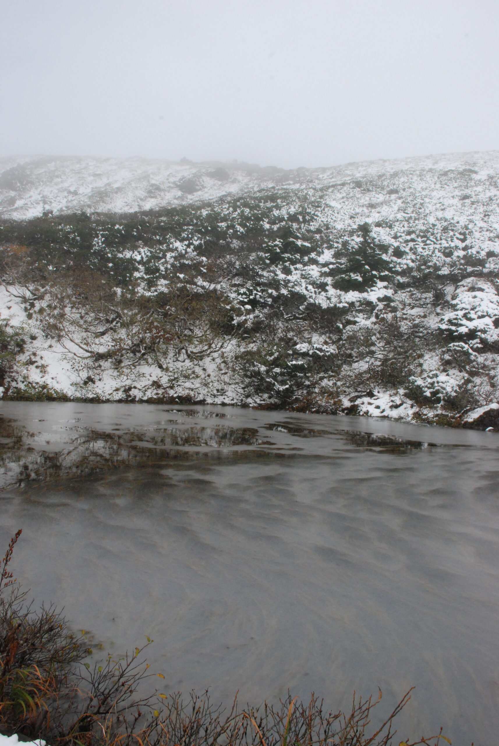 山頂直下の鏡沼は凍り、2日前に降った初雪が残っています