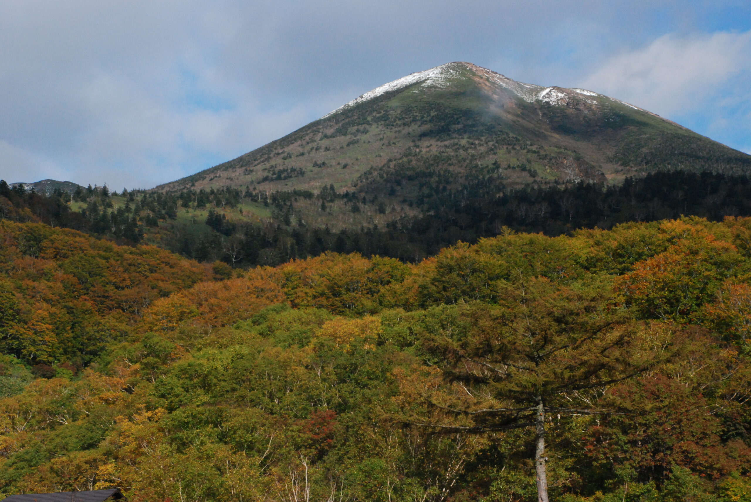 下山すると晴れてきて、冠雪した山頂と紅葉が望めました