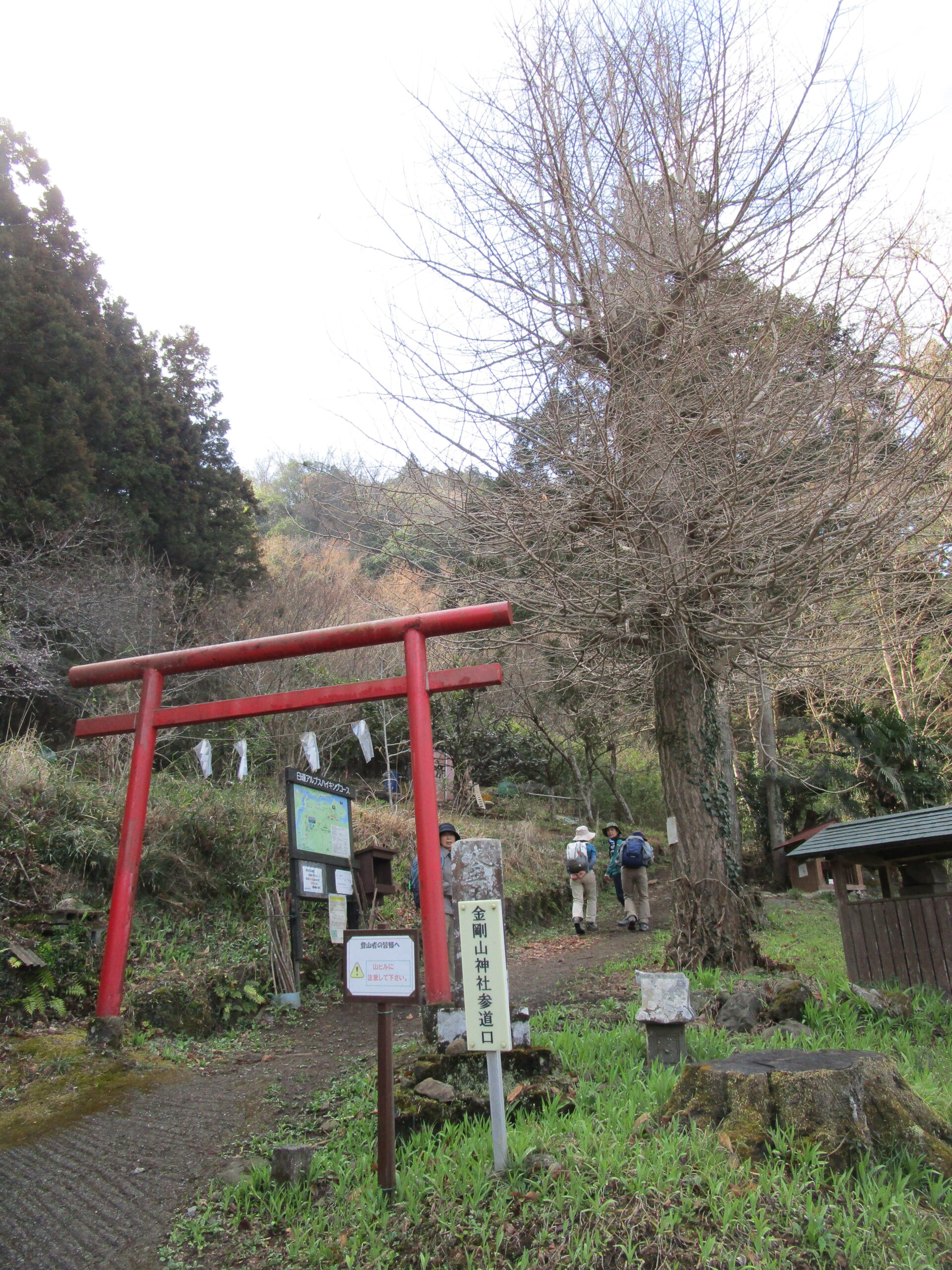 登るのは、相模湖の南西にあり、400m級の六座が連なる「日連アルプス」。GPSの軌跡がティラノサウルスそっくりなことから「ティラノサウルスルート」と呼ばれて最近人気が高まっています。JR中央線藤野駅近くの駐車場に車を停め、金剛山神社参道口から山道に入ります。