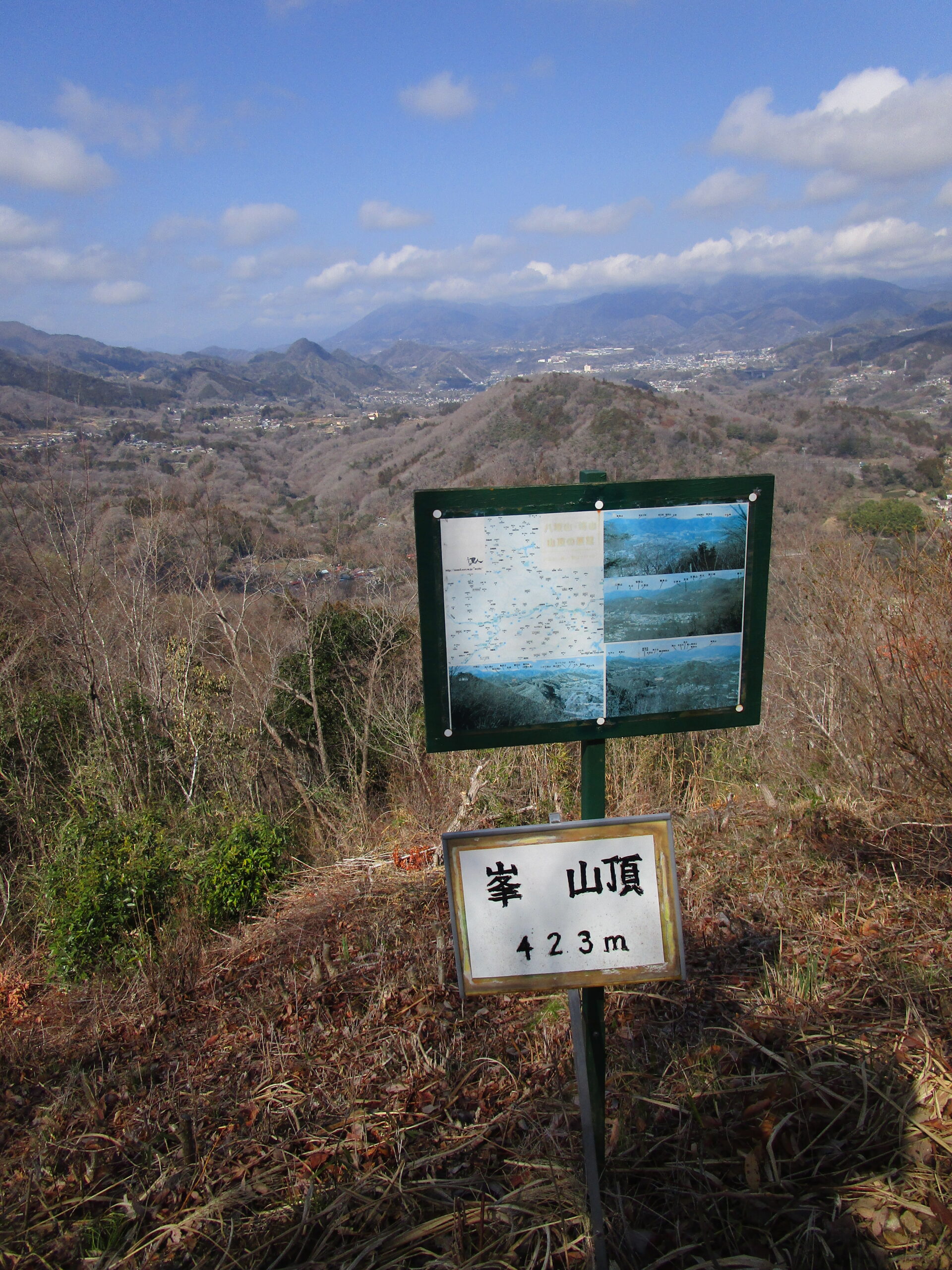 峯山頂(423m)に到着。この日一番の眺望で、山梨県の中央線沿線の滝子山や扇山が望めました。ベンチにいた地元の方と話すと、「もう1000回以上は登っている」「裏庭のようなもの」とのこと。全員で会の旗を広げたところを写真に撮ってもらいました。