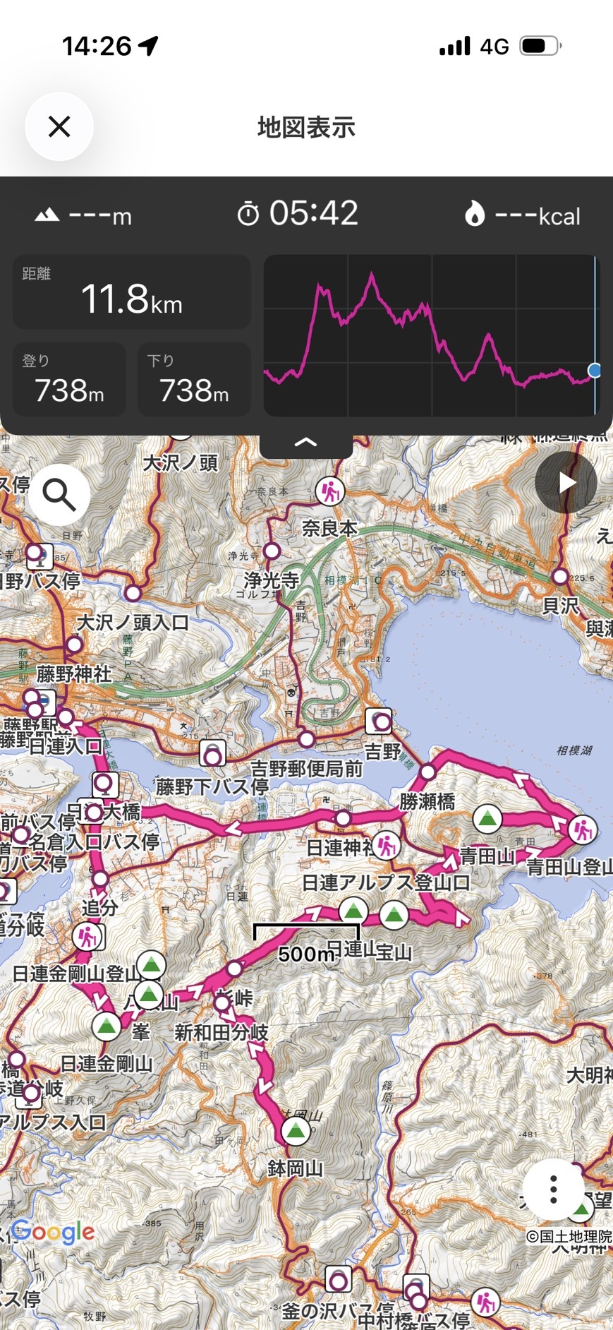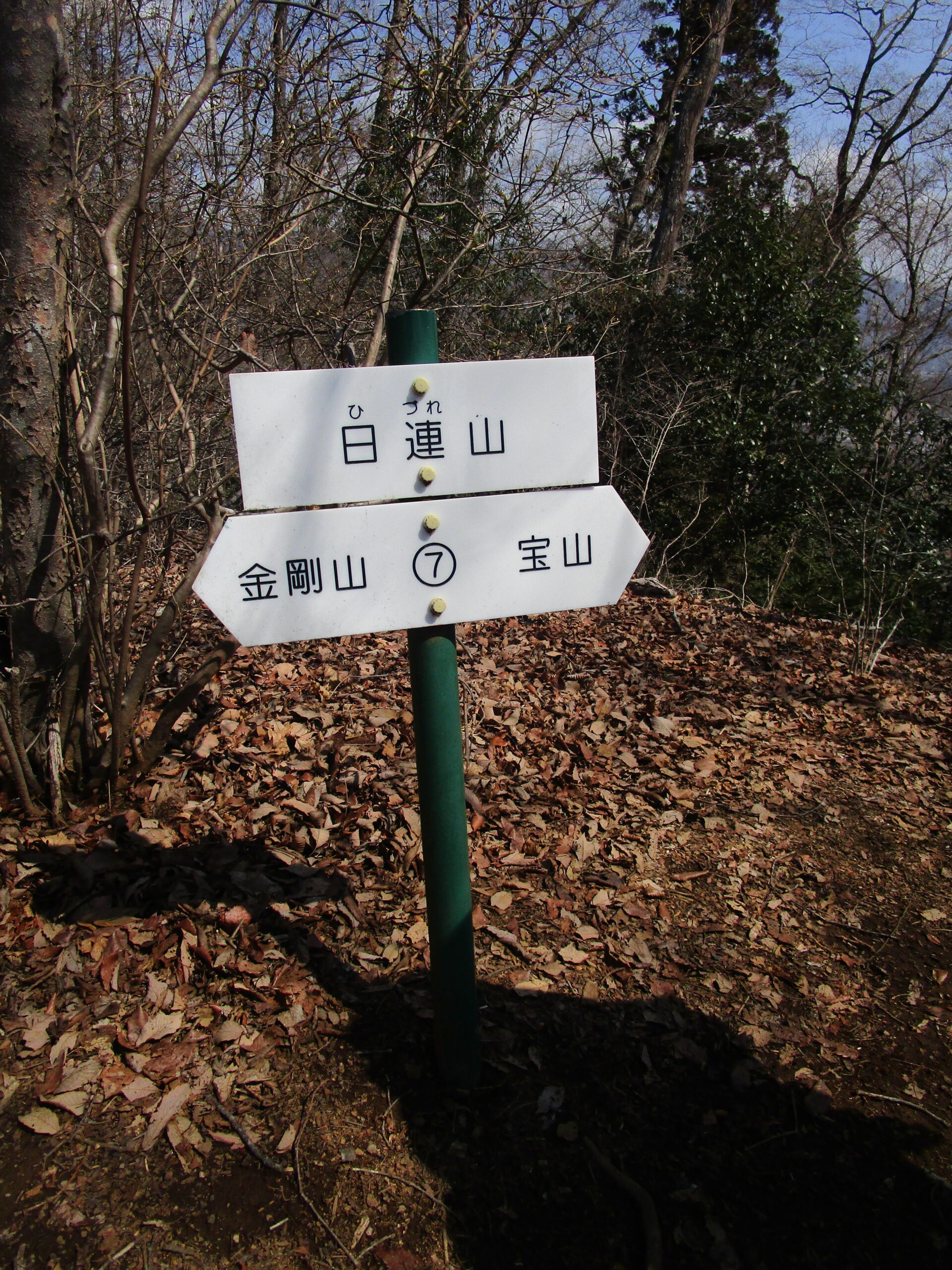 藤野駅8:37→金剛山神社参道口8:53→金剛山9:27→峰山9:37→杉峠9:57→鉢岡山(休憩)10:20/10:40→杉峠10:55→日連山11:10→宝山11:22→青田山(昼食休憩)12:37→藤野駅14:15