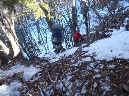 取付き付近が岩場の急斜面であったが、全体に雪も少なくフィックスロープも多く、特に持参したロープを使う様な所はありませんでした。